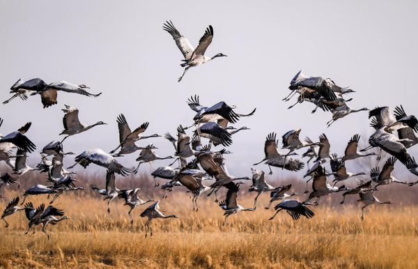 生态修复不仅是偿还历史“生态债”,更是为未来“储值”。天蒙蒙亮,石嘴山市惠农区迎河湾的芦苇荡里,黄河岸边坚守了八年“追鹤人”陈小组已顶着寒露蹲守了一个小时。顺着他镜头对准的方向望去,两公里开外的黄河中央一片浅滩上,国家二级保护动物灰鹤成群结队,或追逐打闹,或低头觅食。
