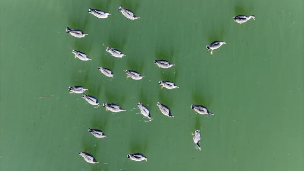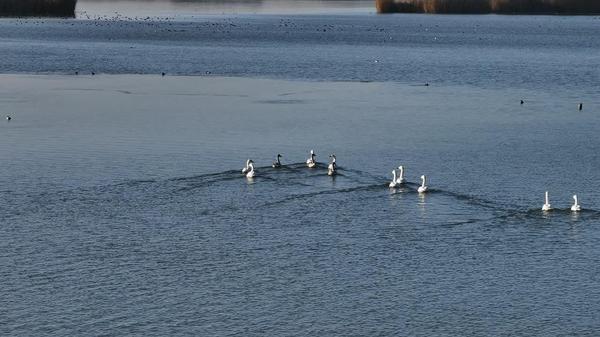 “听!大雁在叫!”说话间,李辉民停顿下来,被悠悠雁鸣声所吸引。无人机镜头下,千只规模的大雁排成“人”字形往复徘徊;晴空中,十几只白天鹅更是腾空而起,宛若精灵。