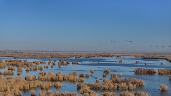 往年10月底便南迁的候鸟们,今年一直逗留到11月下旬。大雁、灰鹤、天鹅等,万鸟齐飞,此起彼伏,起落滩涂间,如乐章般在湿地间奏响。