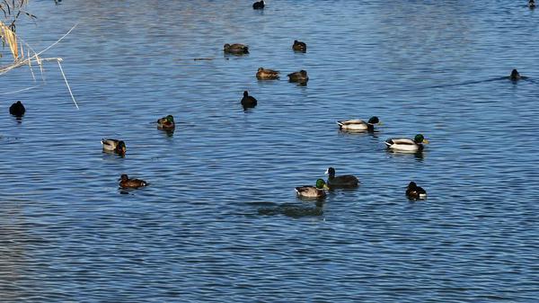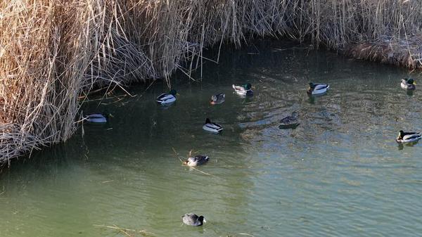 再看中心湖里,野鸭悠闲凫水,有灰头、绿头的,还有有白喙、黄喙的,单论品种就有四种。