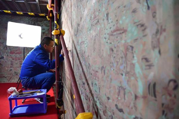 2022年4月19日,敦煌研究院文物保护技术服务中心壁画修复师在修复出现病害的壁画。新华社记者 陈斌 摄