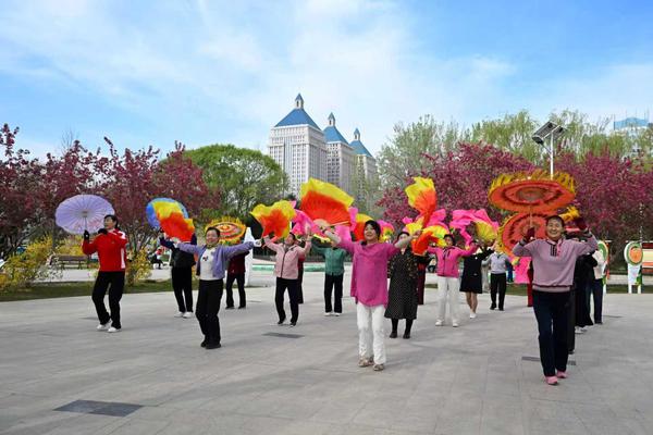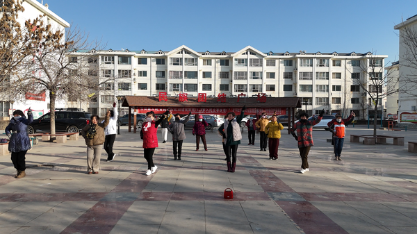 在银川市西夏区共享社区的民族团结广场上,不同民族的居民们正在晨练。