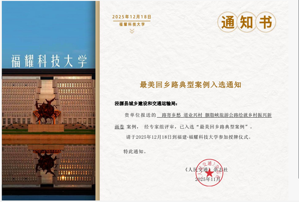 12月24日,记者从固原市泾源县获悉,该县申报的胭脂峡旅游公路项目,在近日举办的2025人民交通大会上成功入选“最美回乡路典型案例”。