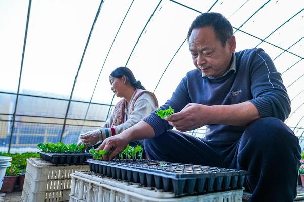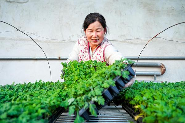 工作人员在育苗圃里挑选壮实的菊苗。