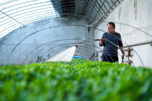 工作人员给新扦插的菊苗浇水。