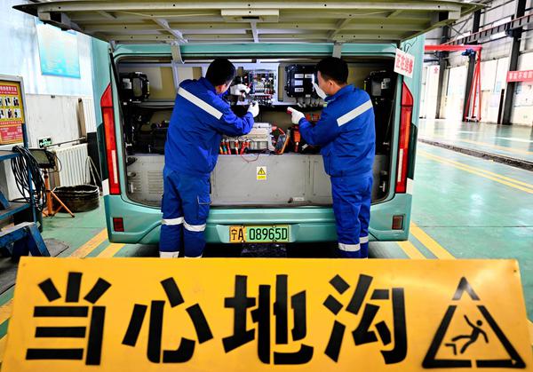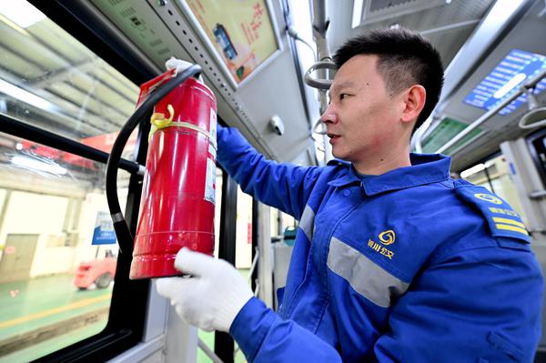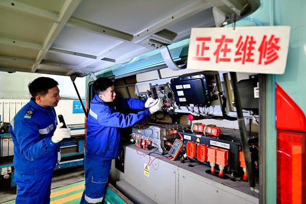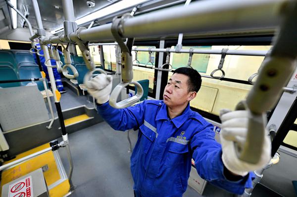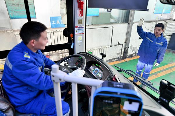 维修师傅们正顶着低温对公交车开展全面“体检”。