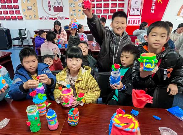刚完成作品的小朋友举着亲手制作的泥塑花瓶,眼睛里满是惊喜与自豪。