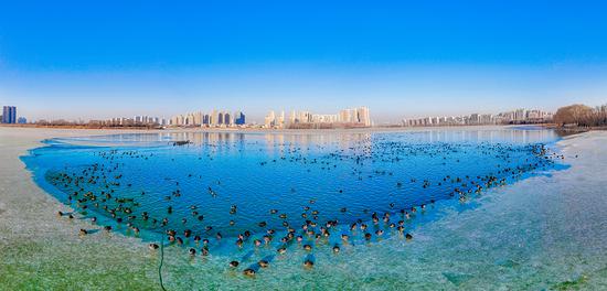 1月17日清晨,银川七子连湖的寒雾尚未散尽。在冰封的湖面中央,一片澄澈的未冻水域中,成群的骨顶鸡舒展羽翼、自在畅游。生态环境的持续改善,让银川成为候鸟迁徙路上的“优选驿站”与“越冬乐园”。 记者 马楠 摄