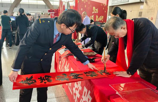 现场不仅有归家游子,还有坚守一线的司乘人员。几位动车组工作人员拿到“一帆风顺年年好 万事如意步步高”的对联后,立即拍照发到工作群:“今年咱班组也有手写春联了!”
