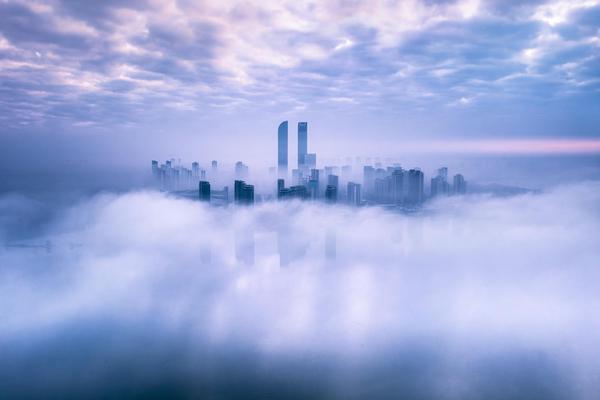 云雾漫过楼宇,冷调天光晕染城郭,恰似仙境落人间,空灵又磅礴。