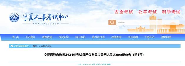 6月13日,宁夏公务员局发布《宁夏回族自治区2024年考试录用公务员拟录用人员名单公示公告(第1号)》。