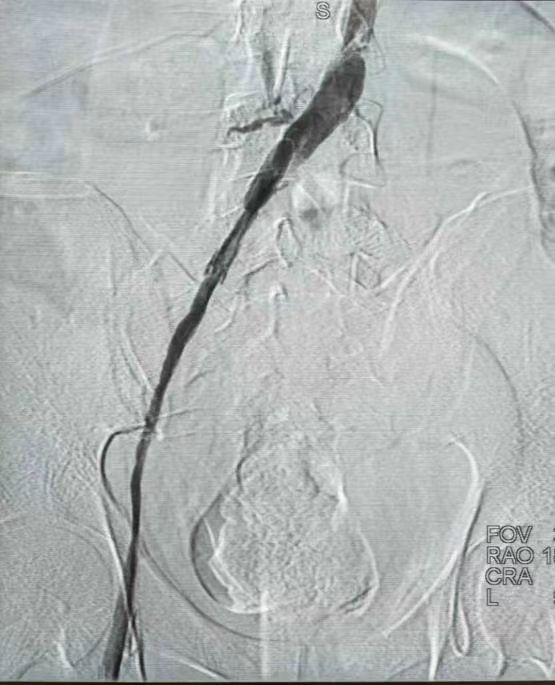 2月10日下午5时许,年轻的井师傅被送到固原市人民医院急诊科,“当时左腿都是黑的、肿的,感觉要炸裂了。”井师傅说。经检查诊断:左下肢深静脉全程血栓+左髂静脉全程闭塞+下腔静脉部分闭塞。通俗地讲,就是从左小腿到大腿一直到肾的水平位置,长达1米的静脉血管严重堵塞,血液无法流通。这条血管界的“连环死胡同”让医护人员大为吃惊,“这么长段的血栓,随时可能脱落,一旦脱落会引发致命肺栓塞,猝死的风险极大”。当晚,医疗团队便采取措施先将下肢堵塞的部分打通,降低生命危险系数,次日再将剩余部分打通。