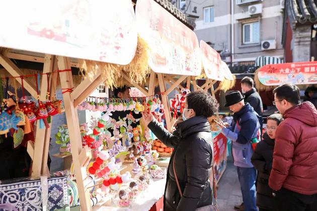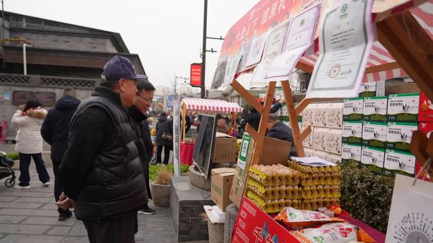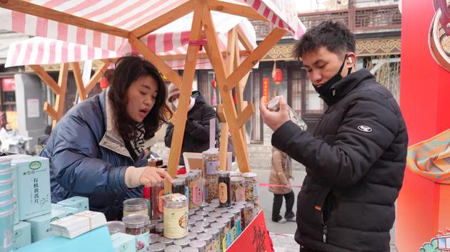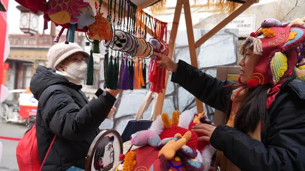 长街古道里,街头巷尾处。从模式口大街东口行至龙王庙广场,一路上不仅店铺林立,还有因新春市集而增设的年货摊位,各地美食、特色小吃、手工艺品、农副产品琳琅满目,“固原绣娘”手工非遗展和“妈妈油香”年货展摊位一字排开。