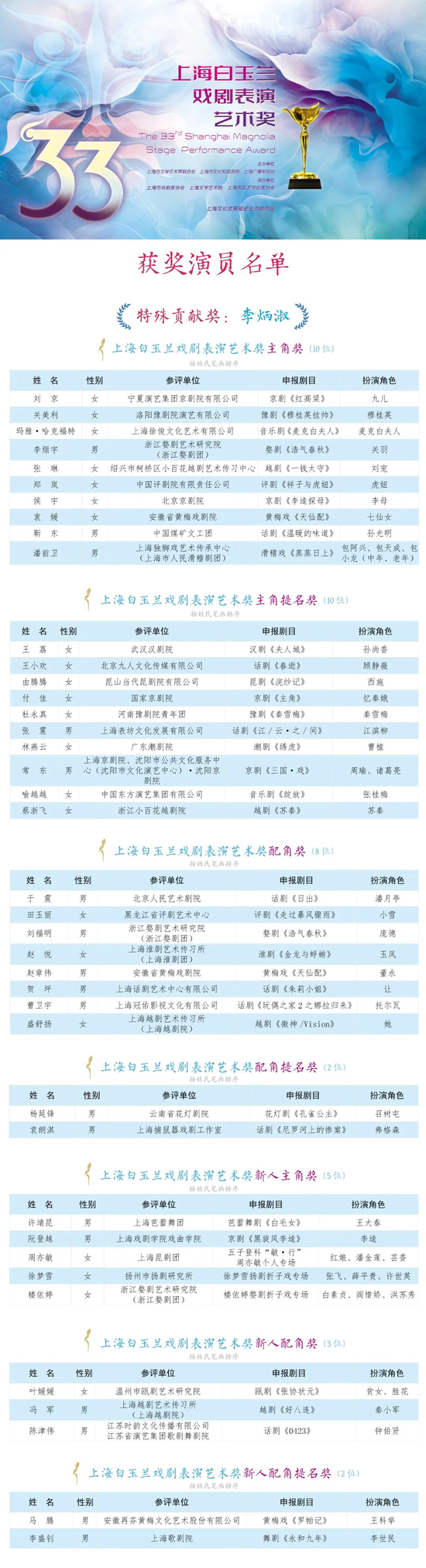 在第33届白玉兰戏剧奖的各奖项角逐中,刘京、关美利、玛雅·哈克福特、李烜宇、张琳、郑岚、侯宇、袁媛、靳东、潘前卫(按姓氏笔画排序)获主角奖,于震、田玉丽、刘福明、赵悦、赵章伟、贺坪、曹卫宇、盛舒扬(按姓氏笔画排序)获配角奖。许靖昆、阮登越、周亦敏、徐梦雪、楼依婷(按姓氏笔画排序)获新人主角奖,叶媛媛、冯军、陈津伟(按姓氏笔画排序)获新人配角奖。