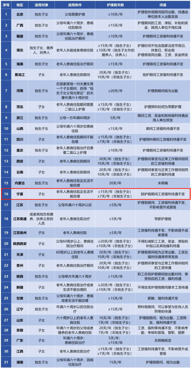 其中,值得注意的是,还有10余省份,非独生子女同样可享受护理假,不过假期天数少于独生子女。例如,山东、安徽、宁夏、四川、江西、湖北规定,非独生子女每年可获得最多7天护理假,天津、云南、黑龙江、贵州、新疆达到10天。