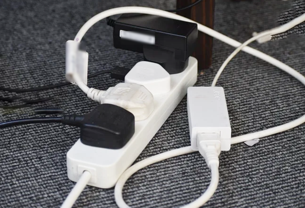如果同时接入多个大功率电器,比如将电热水壶(1500瓦)和微波炉(1000瓦)插在同一个10安(A)的插线板上,总功率就会超过插线板2200瓦的承载极限,若同时开启就会导致过热甚至起火。