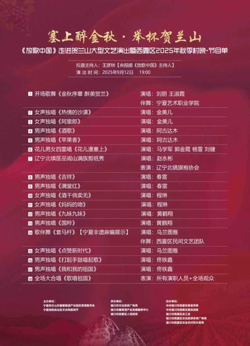 本次演出以“塞上醉金秋·举杯贺兰山”为主题,同时也是西夏区2025年秋季村晚的重要组成部分,双重意义叠加,精彩值得期待。演出将以热烈欢快的《金秋序章醉美贺兰》拉开帷幕,让丰收的喜悦瞬间铺满现场;更有宁夏花儿独特旋律贯穿全程,带你深度触摸当地文化的独特魅力。