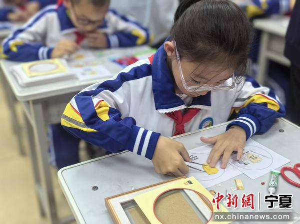 采访团到达彭阳县。图为彭阳三小同学制作麦秆画非遗法治文创作品。宁夏党委网信办供图