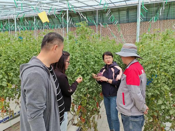 自治区政协委员刘媛向种植户教授番茄潜叶蛾防控技术措施。