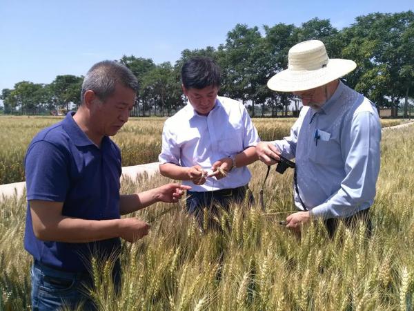 自治区政协委员陈东升深入田间与技术人员一起了解小麦长势情况。