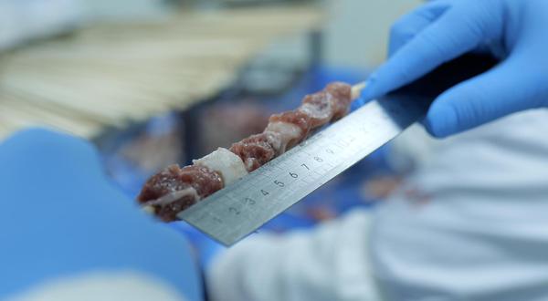 为确保品质,盛飞豪员工们会测量每一支肉串的长度。