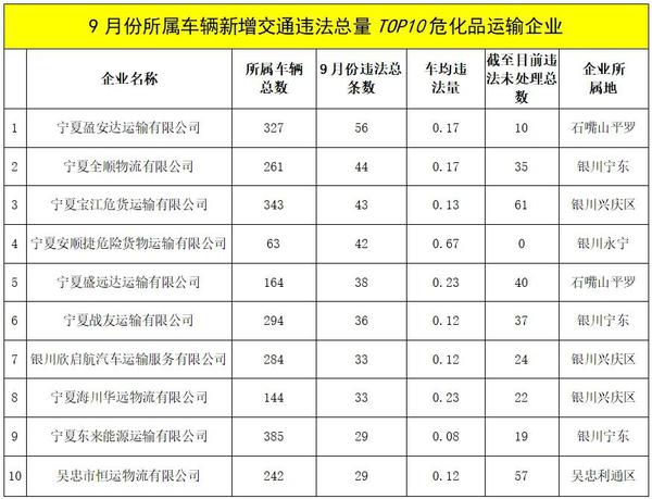 近日,宁夏公安厅交通管理局梳理了2025年9月份全区交通违法突出的10家危化品运输企业进行了曝光。