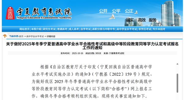 近日,宁夏教育考试院发布,关于做好2025年冬季宁夏普通高中学业水平合格性考试和高级中等阶段教育同等学力认定考试报名工作的通知。