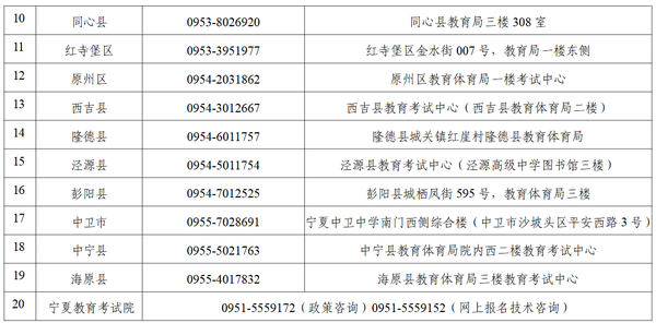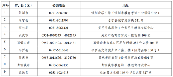 4.考生须在1月2日—11日登录“宁夏教育考试院普通高中学业水平考试报名系统”自行打印准考证。各级教育考试中心和学校要对考生打印准考证的情况及时进行检查,提醒考生认真核对姓名、准考证号、考试科目和照片等信息,发现错误信息及时向学校或市、县(区)教育考试中心反映,市、县(区)教育考试中心联系方式见下表: