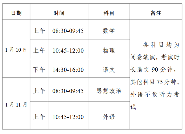 2025年冬季合格考考试时间为1月10日至11日,开考5个科目,分别是语文、数学、外语、思想政治、物理,各科目均为闭卷笔试,考试时长语文90分钟,其他科目75分钟,外语不设听力考试。具体时间和科目详见下表