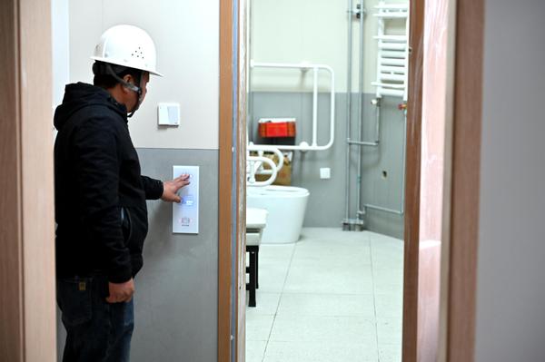 项目负责人现场演示无障碍卫生间智能控制系统。该卫生间配备了适老化扶手、智能感应设备等设施,从细节处体现对残疾人使用需求的贴心考量。