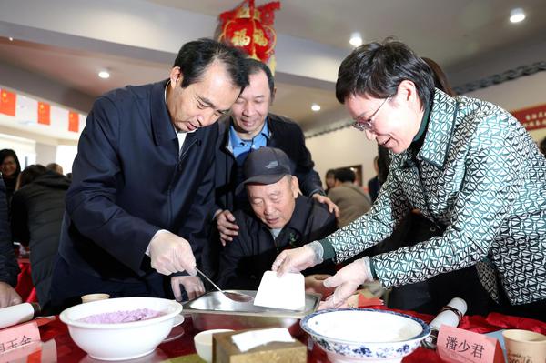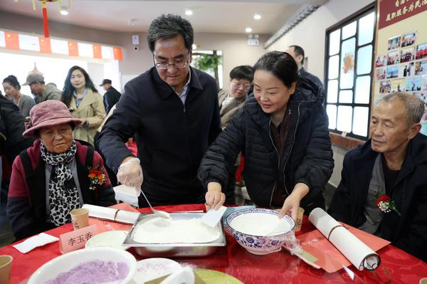 宁夏回族自治区政协主席陈雍、副主席许宁和参加活动的老人一起制作重阳糕。