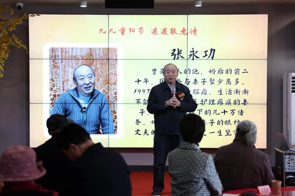 在热烈掌声中,获奖代表张永功与华林社区代表杨慧荣先后分享日常里的“孝亲故事”。“我每天照顾老伴的日常起居,儿子有空就帮着按摩。日子虽平淡,可看着老伴眼里有光,就觉得值。”张永功讲述多年来与儿子共同照料老伴的日常,话语朴实却满含深情。清晨的热粥、深夜的守护,如细碎星光拼凑出动人的亲情画卷,让温暖在现场悄然蔓延。杨慧荣则分享了照料88岁患脑梗的父亲与患老年痴呆母亲的日常点滴:“父亲行动不便,我就每天扶他慢慢走;母亲记不清事儿,我就把家人的名字写在卡片上,一遍遍念给她听。”没有华丽的辞藻,却字字透着坚守与责任。在场不少人员红了眼眶,指尖轻拭眼角泪花,现场满是感动与共鸣。