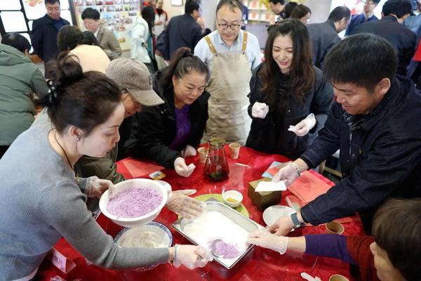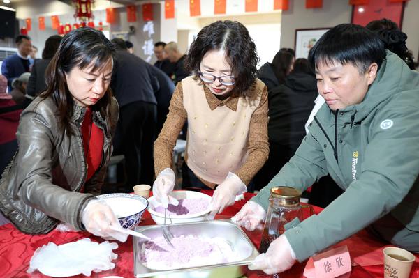 自治区政协委员宝玲玲(左)、马国庆(中)与大家一起制作重阳糕。