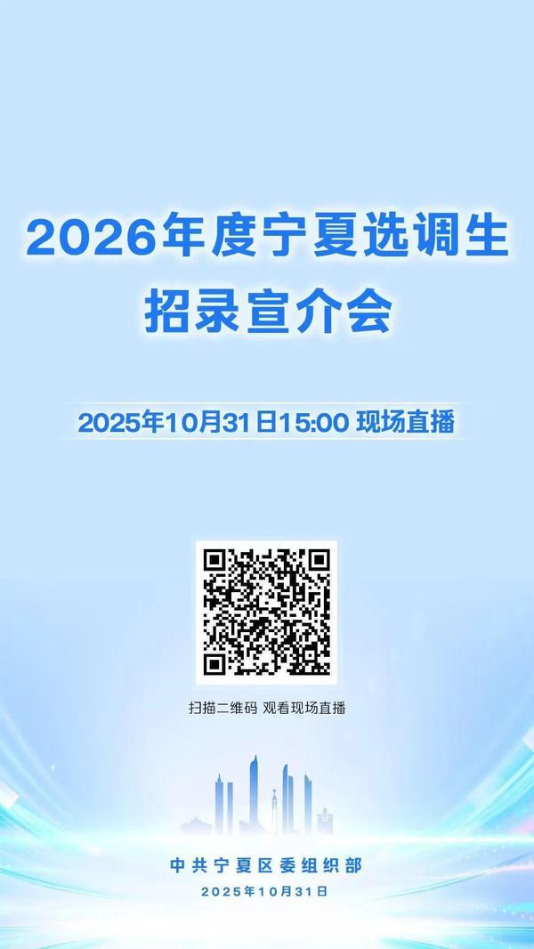 10月31日(星期五)下午15时,宁夏回族自治区党委组织部将召开2026年度宁夏选调生招录宣介会,欢迎大家扫描二维码观看、参与!