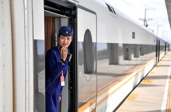 11月6日,国铁呼和浩特局包头客运段列车长杨静雯进行包银高铁试验车发车前瞭望。