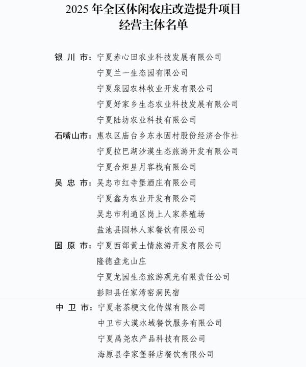 2025年全区休闲农庄改造提升项目经营主体名单。