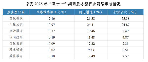 同时,服务型消费从“趋势”固化为“定势”,成为消费增长新引擎。受“全国扩大服务消费”政策与平台升级双重驱动,宁夏服务型网络零售额3.9亿元,同比激增23.56%。其中在线餐饮、在线旅游、生活服务增速分别达26.38%、24.41%、19.46%。消费者不再局限于购买具象商品,而是通过餐饮预订、酒店度假、知识付费等服务,构建理想生活场景。