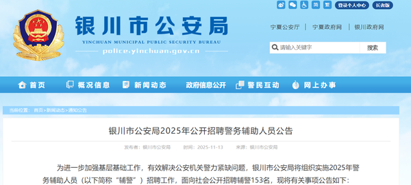 11月13日,银川市公安局官方网站发布关于2025年公开招聘警务辅助人员的公告,面向社会公开招聘辅警153名。
