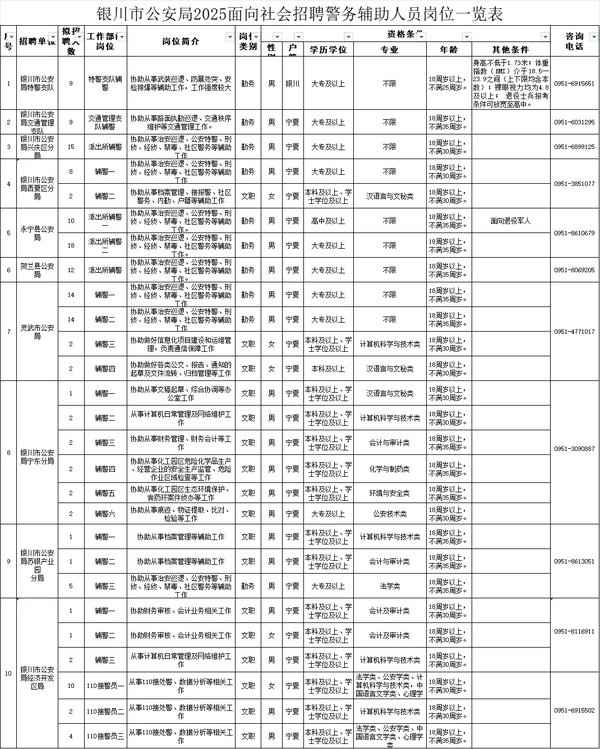 政策咨询电话详见《银川市公安局2025年公开招聘警务辅助人员岗位一览表》。报名平台技术支持电话:4000010370举报电话:0951-6915061。