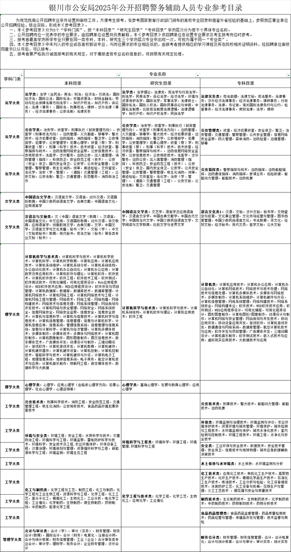 银川市公安局2025年公开招聘警务辅助人员专业参考目录