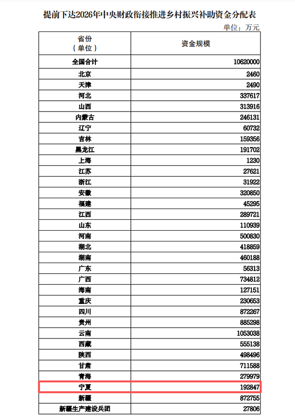 近日,财政部网站发布提前下达2026年中央财政衔接推进乡村振兴补助资金分配表,分配表显示,宁夏获192847万元补助。