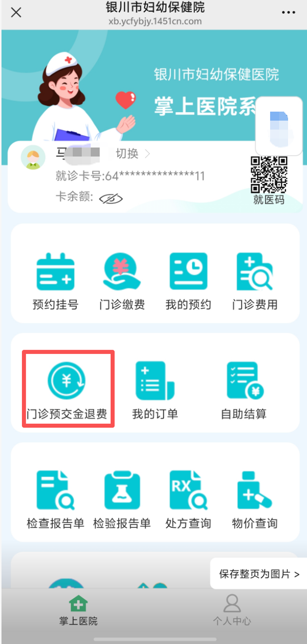 02 进入功能微首页点击“门诊,预交金退费”,申请退费。