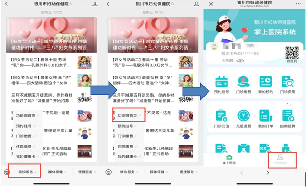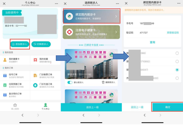 微信公众号搜索“银川市妇幼保健院”→就诊服务 →功能微首页→个人中心→添加就诊人→绑定院内就诊卡→输入手机号及验证码→查询→选择就诊卡→点击确定→绑定成功。