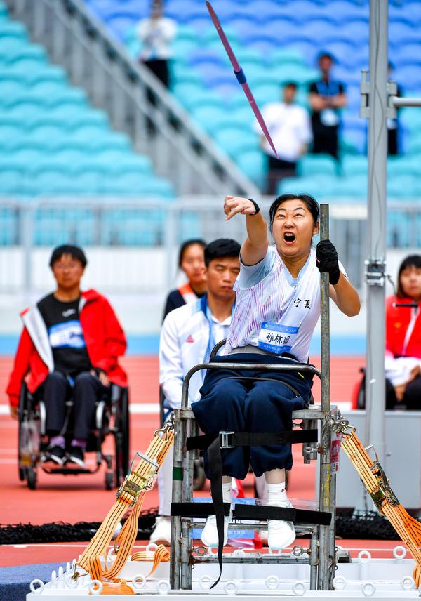 12月10日,广东奥体中心,参加女子标枪F52级比赛的宁夏选手孙林娟在奋力投掷。