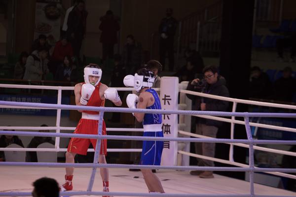 宁夏拳击运动员张文鑫(红方)在比赛中。