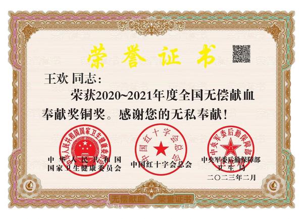 王欢荣获2020至2021年度全国无偿献血奉献奖铜奖。
