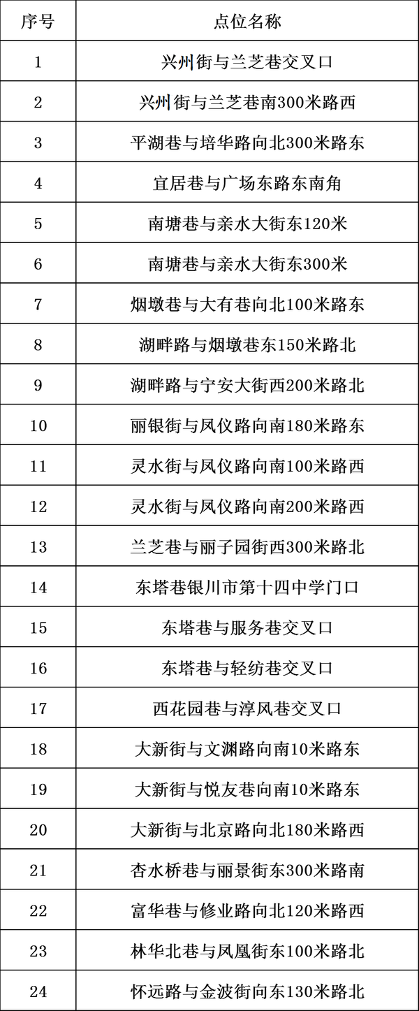 为进一步规范道路交通秩序,促进广大交通参与者文明出行,确保道路安全畅通有序,根据《中华人民共和国道路交通安全法》等有关法律、法规规定,结合实际道路情况,银川市公安局交通管理局新建24套违停抓拍设备,并决定自12月19日起启用,现将具体点位公示如下: