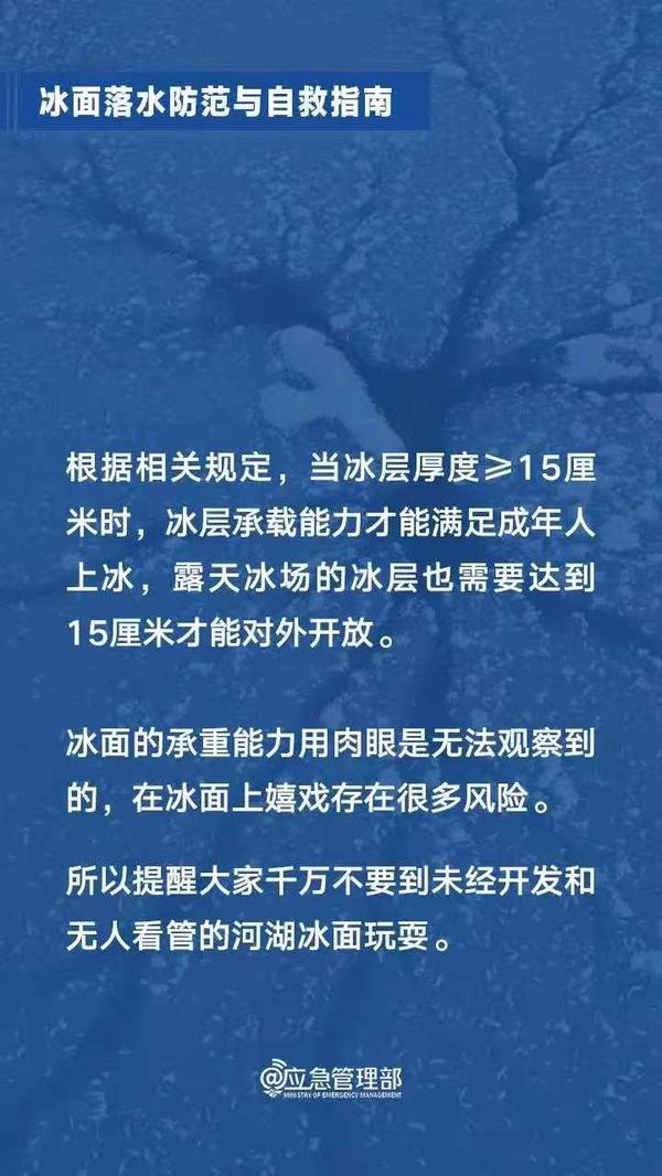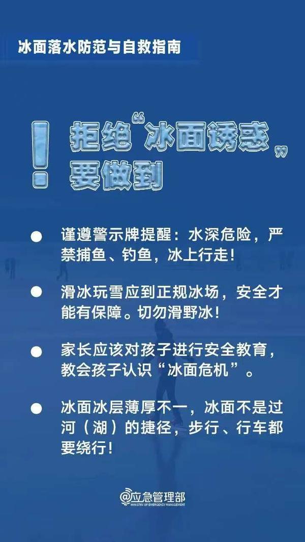 近期,气温波动大,冰层厚度不均,冰面的承重能力用眼睛是无法观察到的,一旦冰面破裂,极易发生坠冰、溺水事故。请广大市民提高警惕,远离河湖、水库等野外冰面,不要在上面行走、奔跑、玩耍、滑冰、垂钓、驾车或进行其他任何活动。