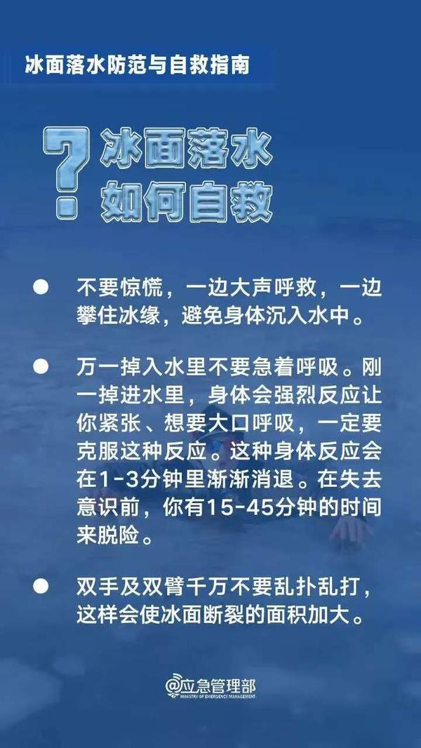 首先来看,掉入冰窟有多危险?厚衣服浸水后易变沉,遇险者在自救时行动极其不便。冰面下水温低,身体会受冷产生冲击反应,称为“躯干反射”,使人想要大口喘气,并导致人体短暂休克,增大溺水风险。冰面下水是流动的,人突然掉进去难找到原来的洞口。易碎的冰层增加了救援难度。