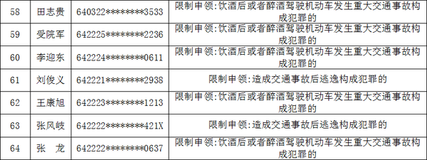 为加强交通安全宣传和警示教育,强化社会监督和舆论倒逼,倡导尊法守规明礼的文明交通行为,有效预防和减少道路交通事故,积极创造安全畅通有序的道路交通环境,公安厅交通管理总队梳理曝光2025年全区终生禁驾人员。在64名终生禁驾人员中,年龄最大的71岁,年龄最小的20岁,其中有24人因造成交通事故后逃逸构成犯罪被终生禁驾,有39人因饮酒后或者醉酒驾驶机动车发生重大交通事故构成犯罪被终生禁驾,有1人同时因造成交通事故后逃逸以及饮酒后或者醉酒驾驶机动车发生重大交通事故构成犯罪的两种行为被终身禁驾。具体名单如下: